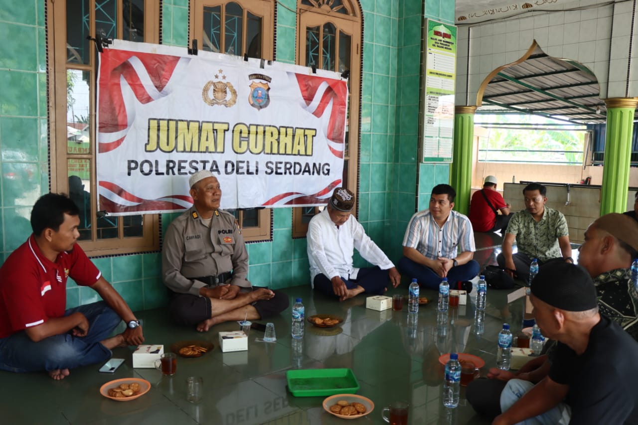 Kegiatan jumat curhat ini di pimpin oleh Kapolresta Deli Serdang Kombes Pol Raphael Sandhy Cahya Priambodo, SIK melalui Kasubbagwatpers Bag SDM Polresta Deli Serdang, AKP Cahyadi, dan dihadiri juga oleh personil Polresta Deli Serdang dan masyarakat sekitar.