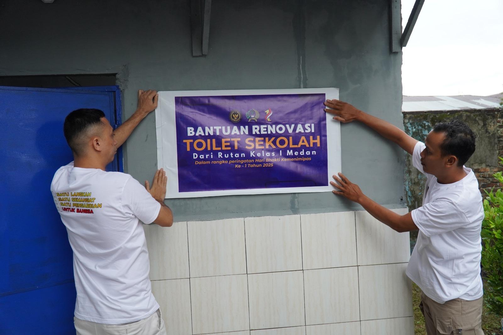 NEWS SLIPE, Medan – Masih dalam rangka memperingati Hari Bakti Kemenimipas ke-1 Tahun 2025, Rumah Tahanan Negara (Rutan) Kelas I Medan melaksanakan kegiatan sosial bertajuk “Imipas Peduli” dengan memberikan bantuan renovasi fasilitas toilet serta pembagian susu kepada siswa SD dan SMP Taruna Karya Medan, Jln. Lembaga Pemasyarakatan. Kegiatan ini sekaligus bertepatan dengan momentum Hari Guru Nasional, yang menambah makna tersendiri dalam upaya mendukung dunia pendidikan. Selasa (25/11/2025).